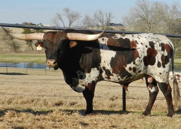 This flashy bull is from Cowboy Chex and RII Lady In Red who is over 85" TTT and is one of the most colorful longhorns in the breed. Check out the genetics of this young bull. Very good horn, size and incredible multi-color spots with brindle. He looks like his famous daddy but with much more color.He is a can't miss young bull. His first calves are awesome check on progeny and see for yourself.