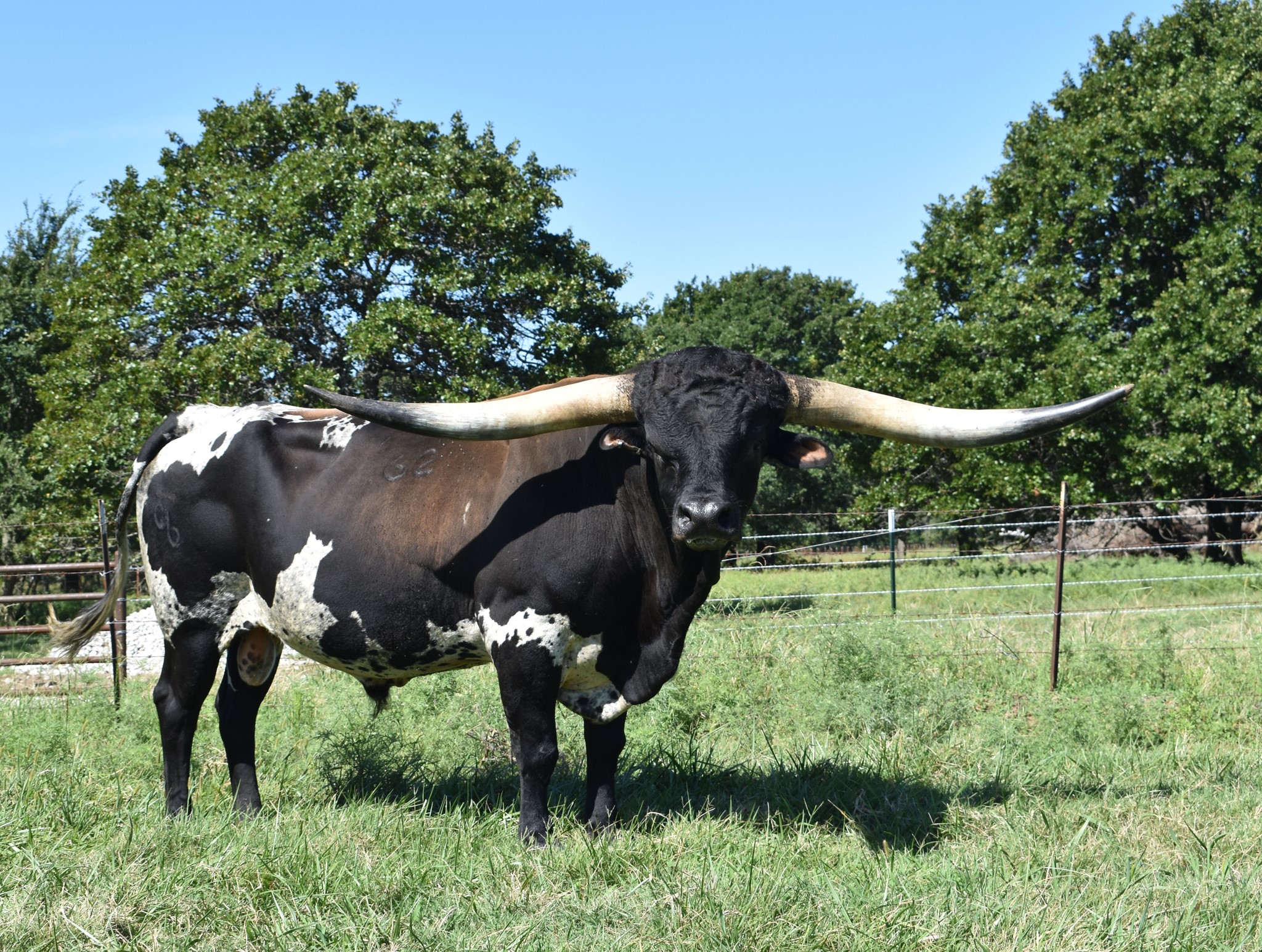 DEL CHARRO was a Game Changer! Unfortunately, he died on March 10, 2025 Early horn growth is an important mile marker. Del Charro is in the TOP TEN (#9) in the entire breed for earliest to reach 70" tip to tip. He passed 70" at 649 days. His last measurement put him at 92" tip to tip. He has a proven record of producing Color, Horn & Conformation. We think he is one of the most powerful and colorful sons of World Record horn champ, Cowboy Tuff Chex. We are incredibly grateful to the Whitlock/Harrell partnership for the opportunity to own this remarkable bull. We have a few (ONLY a few) straws of semen available $200.00 When these are gone there will not be any more. 605-381-3938